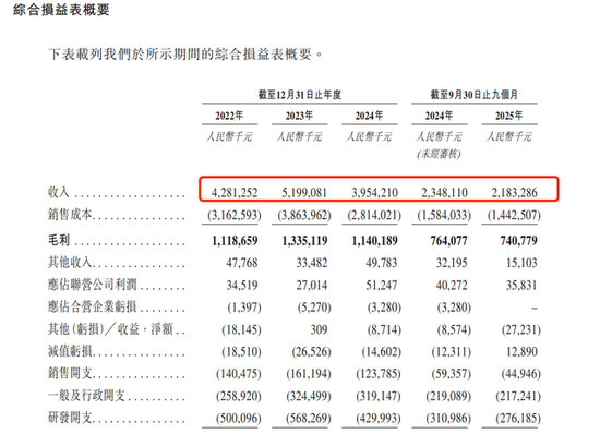2022年营收为42.81亿元,2023年在大额合同确认的推动下,同比增长21.4%至51.99亿元;然而到了2024年,形势急转直下,营收大幅回落24.0%至39.54亿元,收入规模甚至退回至2022年水平以下。截至2025年9月30日止九个月,营收21.83亿元,同比继续下降6.9%,增长动能持续减弱。