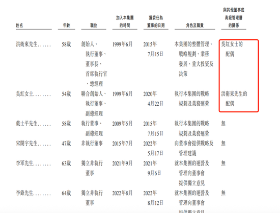 这对“清华夫妻档”构成了公司的核心支柱。根据招股书,58岁的洪卫东作为公司掌舵人,身兼创始人、董事长、CEO、执行董事等多职,主抓战略与决策,并在2023年获评“金融科技领军人才”称号;54岁的吴红作为联合创始人及副总经理,则深耕业务运营。夫妇二人分工明确。