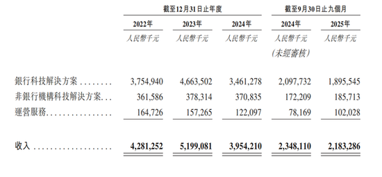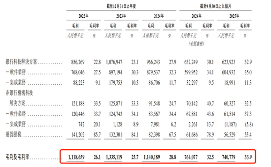 根据招股书显示,宇信科技的主营业务涵盖银行科技解决方案、非银科技解决方案及运营服务三大板块。其中,银行科技解决方案作为核心支柱,2024年收入占比高达87.5%。该板块内部也存在分化:软件开发及服务毛利率为32.3%,而集成业务毛利率仅11.7%。相比之下,非银科技解决方案与运营服务占比分别仅为9.4%和3.1%。尽管运营服务属于高毛利业务,其毛利率已从2022年的85.7%显著缩水至2024年的67.5%。