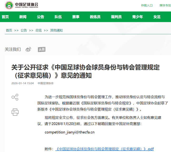 有关单位和各界人士如有意见建议,请于2026年1月20日前,通过以下邮箱回复至中国足协竞赛部:competition_jianyi@thecfa.cn